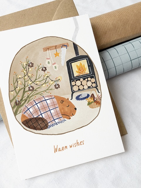 Handgetekende kerstkaart van een slapende bever in zijn sfeervol ingerichte holletje onder de grond. Met leuke details zoals de wanten aan de kapstok en de kerstkransjes aan de takken.