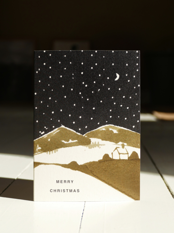 Sfeervolle winter/kerstkaart met huisjes in de sneeuw onder een donkere sterrenhemel, gedrukt op een wenskaart gemaakt van landbouwafval. Getekend door Esther Schuivens.