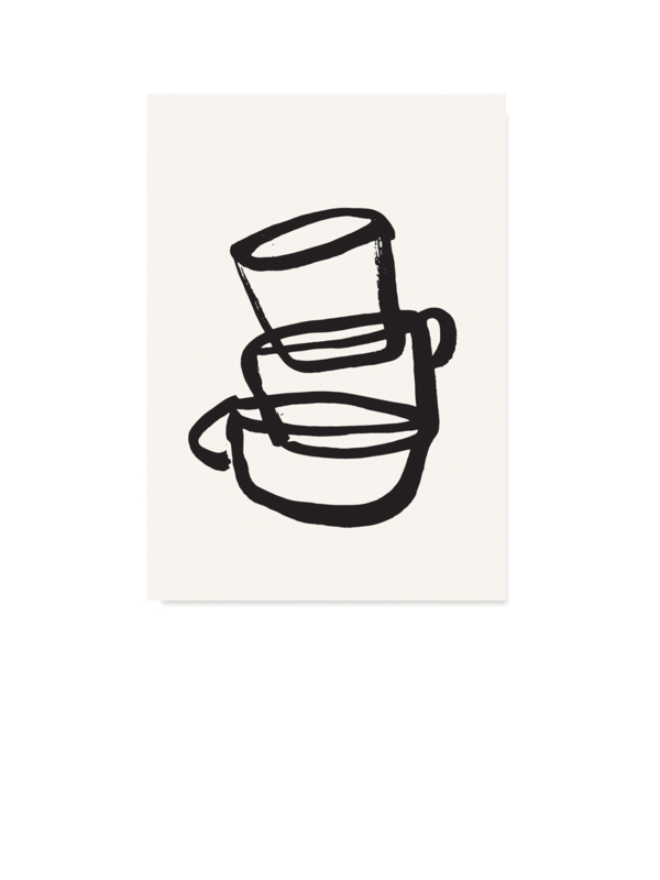 A5 formaat artprint met minimalistisch schilderwerk van gestapelde kopjes, gemaakt door Esther Schuivens. Gedrukt op mooi stevig papier gemaakt van landbouw-afval.