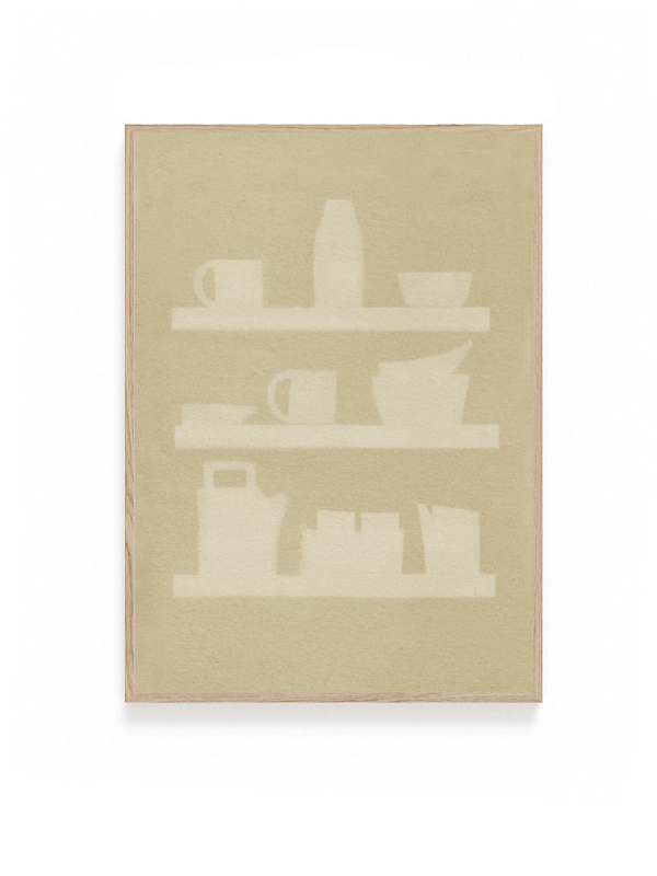 A4 formaat artprint in mooie aardse tinten van drie planken vol keramiek, gemaakt door Esther Schuivens. Een fijn huiselijk tafereel, minimalistisch geschilderd zodat je alleen de contouren van de gestapelde borden, flessen en kopjes ziet. Gedrukt op mooi stevig papier dat gemaakt is van landbouw-afval.