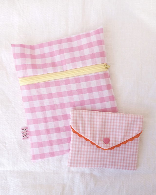 Boterhamzakje met roze ruitjes en gele rits, gemaakt van biologisch katoen.