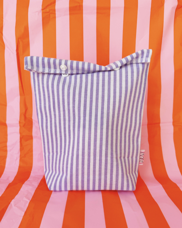 Katoenen lunchtas met lila streepjes om je eten zero-waste in mee te nemen. Er past een katoenen boterhamzakje en wat fruit in. Stop er je to-go bestek bij en een servetje en dan ben je helemaal klaar om te gaan!