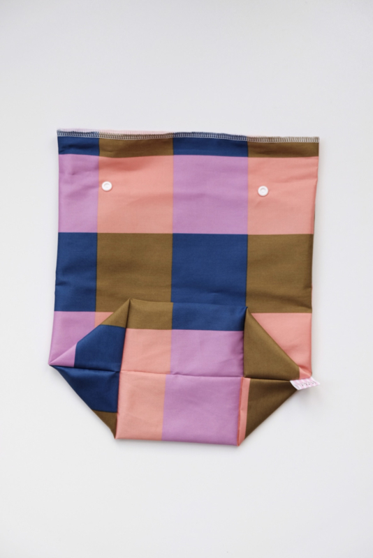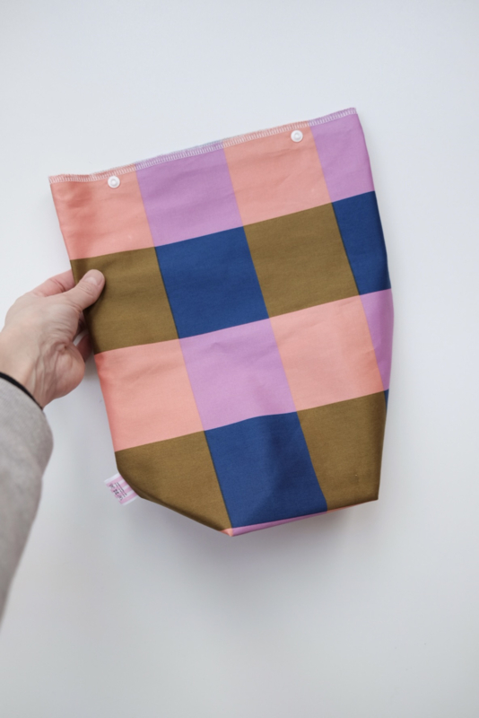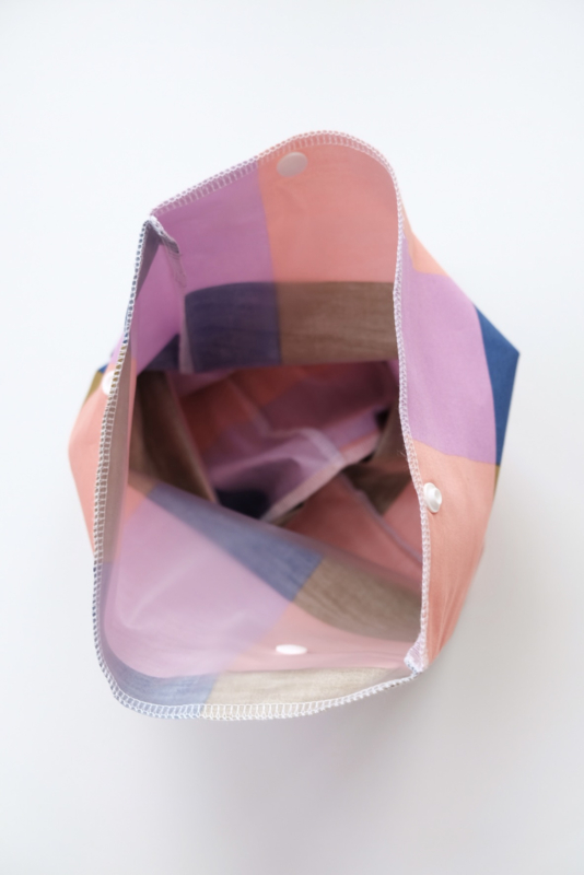 De buitenkant is gemaakt van in dit geval Oeko-Tex gecertificeerd katoen en de binnenkant is gevoerd met een met voedselveilige PUL stof die lucht doorlaat maar geen vloeistof zodat je tas niet kan lekken. Sluit af met 2 drukknoopjes.