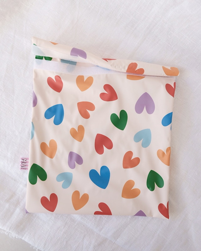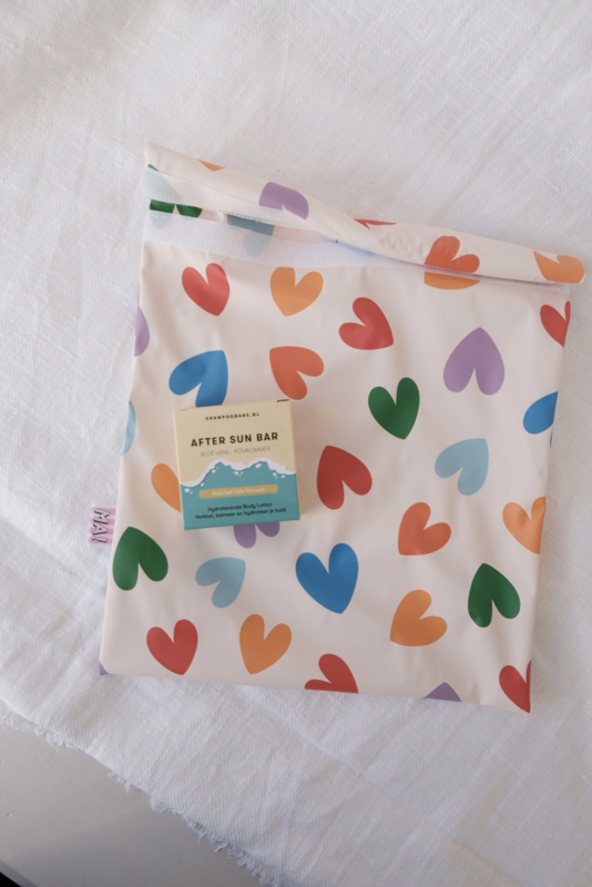 Zak om natte zwemkleding in mee te nemen, met vrolijke hartjesprint. Gemaakt van waterdichte stof en sluit af met stevig klittenband.