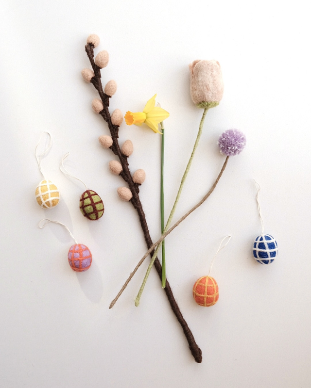 Dit setje eitjes is met de hand gemaakt in Nepal, van 100% wolvilt. De kleuring van de wol is gedaan zonder chemicaliën (AZO-vrij). Het ontwerp is van het Zweedse merk Aveva Design. De eitjes hebben allemaal een andere kleur en zijn geruit met een andere kleur wol.
