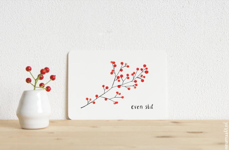 Een mooi getekende kaart met de tekst "even stil", onder een tak met rode bessen.