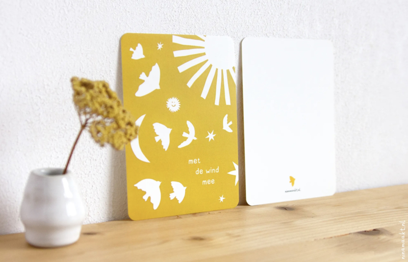 Vrolijke kaart in mooi warm geel met de woorden "met de wind mee".