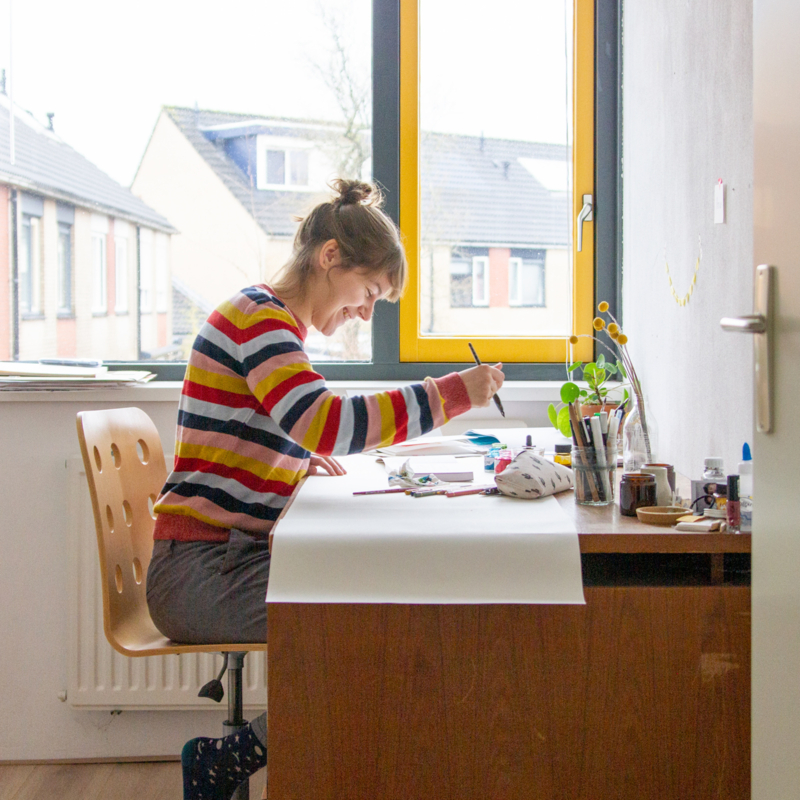 Nina maakte deze illustratie als zeefdruk, werkte ‘m digitaal af en liet ‘m vervolgens drukken op mooi, stevig papier (Biotop 300g/m2). Het formaat is 10,5×15 cm, zoals een ‘gewone’ ansichtkaart. Op de achterkant kun je een boodschap schrijven. Er staan geen adreslijntjes op.