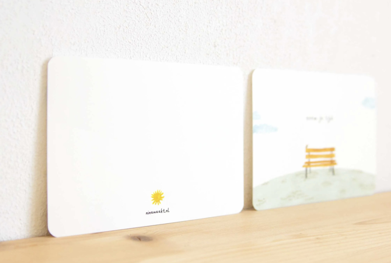 "Neem je tijd" is een fijne kaart om neer te zetten of op te sturen naar iemand die best even stil mag staan en rustig aan mag doen. Met een bankje om op te gaan zitten en een vogel om naar te kijken.