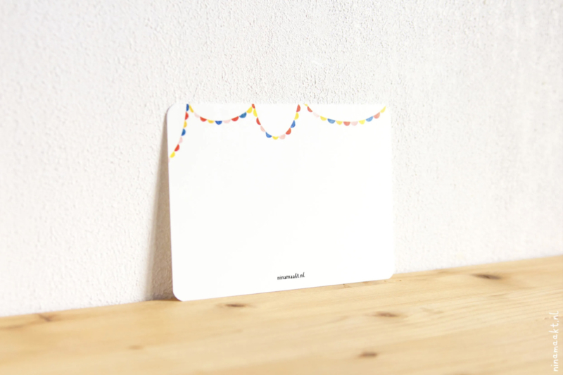 Nina tekende deze kaart met kleurpotlood, ecoline en oost-indische inkt. Ze werkte het ontwerp digitaal af en liet ‘m vervolgens drukken op mooi, stevig papier (Biotop 300g/m2). Het formaat is 10,5×15 cm, zoals een ‘gewone’ ansichtkaart. Op de achterkant staan nog wat slingers en een heleboel schrijfruimte voor een lieve boodschap en het adres van de ontvanger.