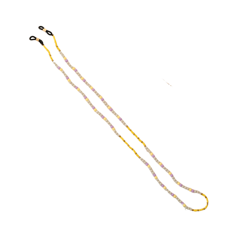 Praktisch en stijlvol brillenkoord van gerecyclede kralen in geel en lila, gemaakt door Sammy Ray.