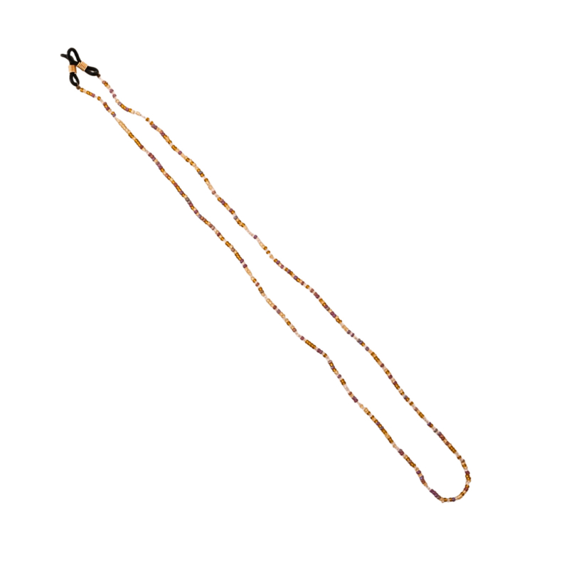 Praktisch en stijlvol brillenkoord van kleine gerecyclede kralen in een mix van bruintinten en paars, gemaakt door Sammy Ray.