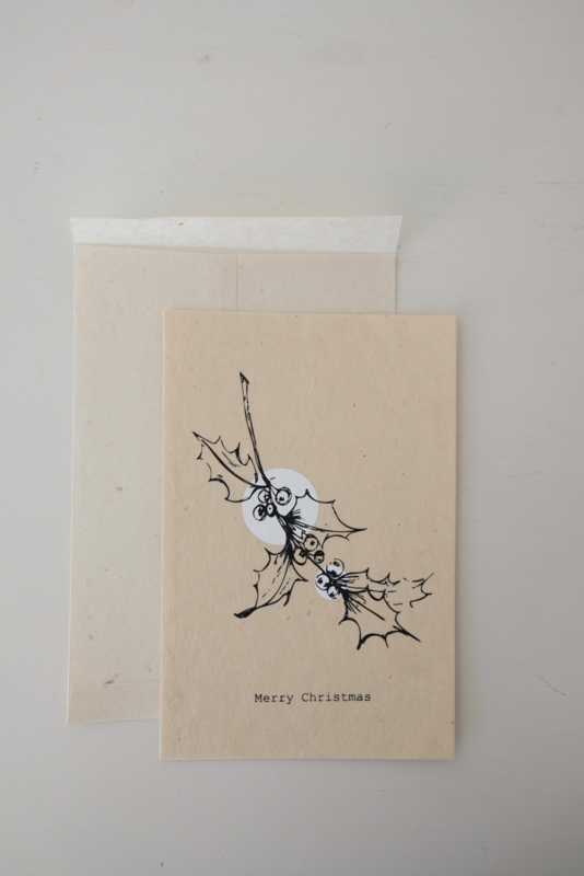 Set van 4 kerstkaarten in 2 verschillende ontwerpen (2x met maretak en 2x met hulsttak), ieder met envelop.