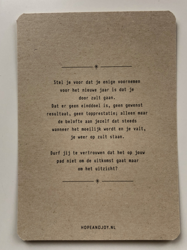 Eco-vriendelijke kaart met inspirerende tekst over het nieuwe jaar. Op de voorkant een kort gedicht en op de achterkant een stukje diepgang over hoe je het nieuwe jaar kunt ingaan.