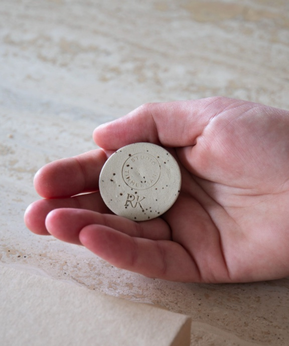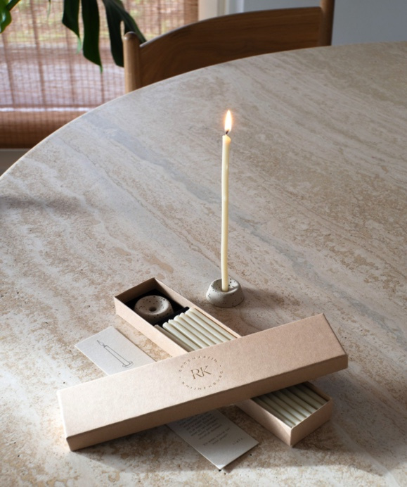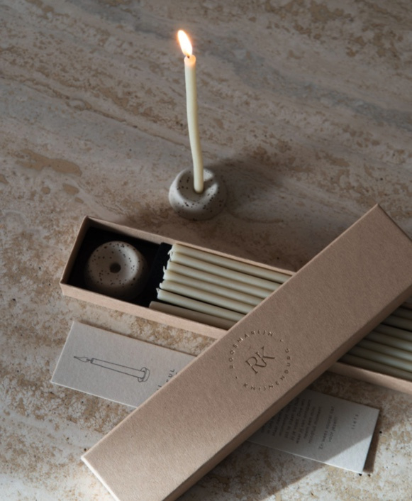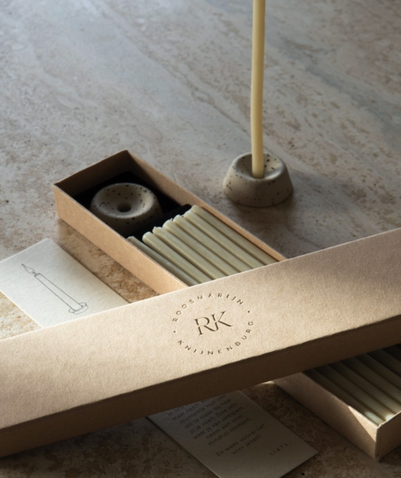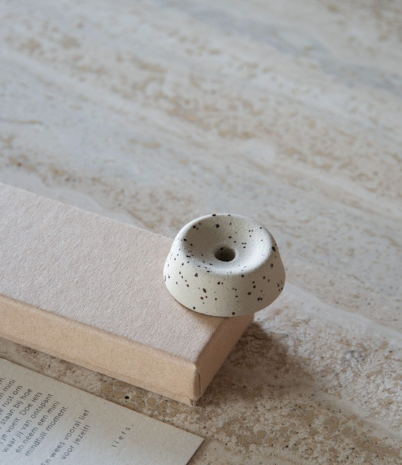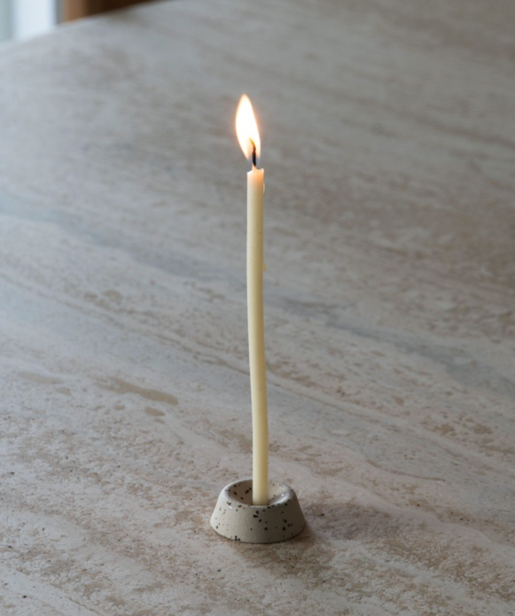 Het kaarshoudertje van gespikkeld steen is speciaal voor Roosmarijn met de hand gedraaid door Sandra van Studio Timmerman. De bijenwas kaarsjes van deze set passen er perfect in.
