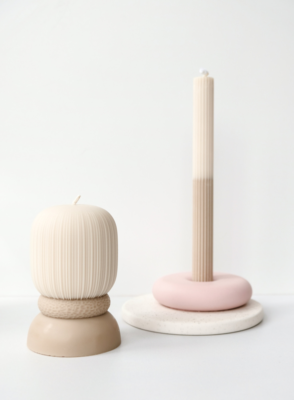 Bijzonder gevormde sculptuurkaars, gemaakt door de mannen van FIK Design. Gegoten van raapzaadwas, in twee tinten taupe.
