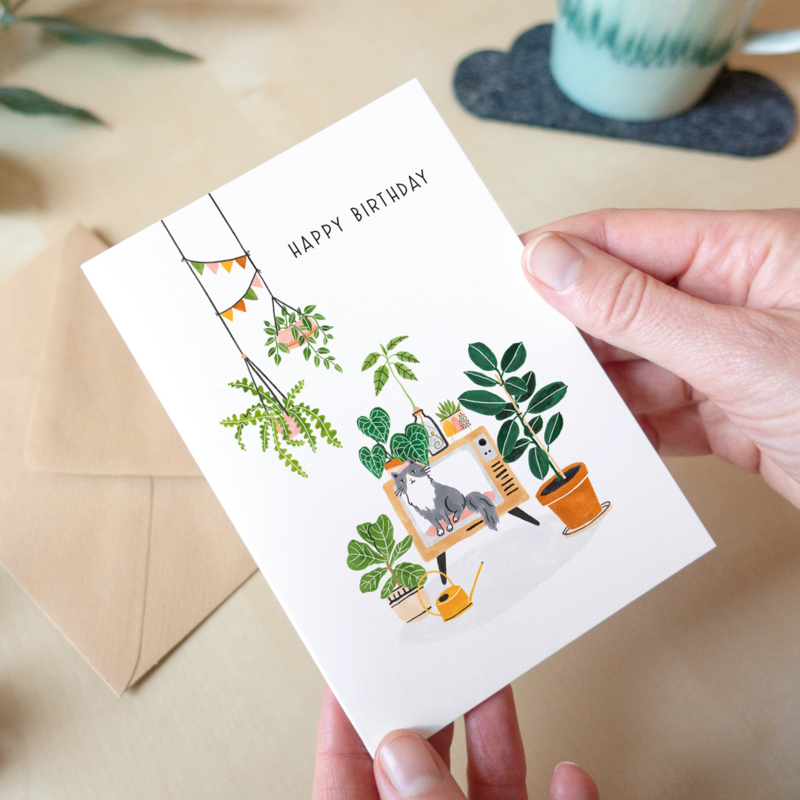 Vrolijke, groene wenskaart om iemand mee te feliciteren. Met verschillende soorten planten en een kat op de voorkant. Aan de binnenkant is de kaart blanco. Er zit een kraftkleurige envelop bij om de kaart in te versturen.