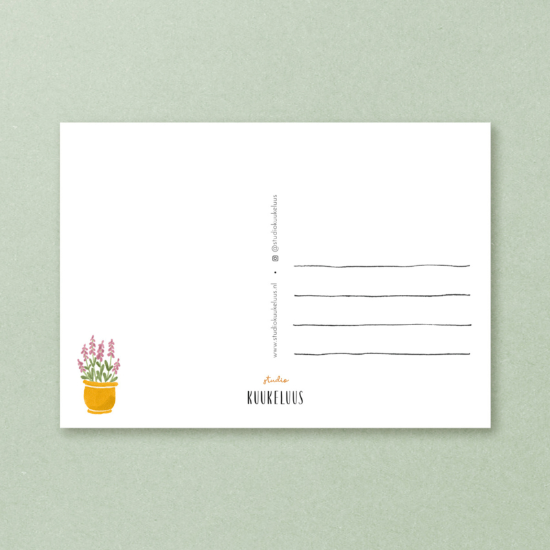 Linda van Studio Kuukeluus is illustrator. Ze tekent en schildert alles waar ze zelf van geniet: het verzorgen van haar kamerplanten, fijne hoekjes in huis en de natuur. De kaarten en posters die ze van haar werk uitprint zijn vrolijk, kalm en groen.