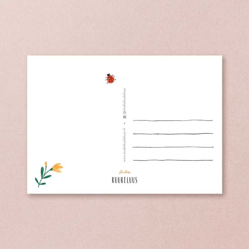 Op de achterkant nog een bloem en een rondkruipend lieveheersbeestje. Inclusief envelop van kraftpapier.