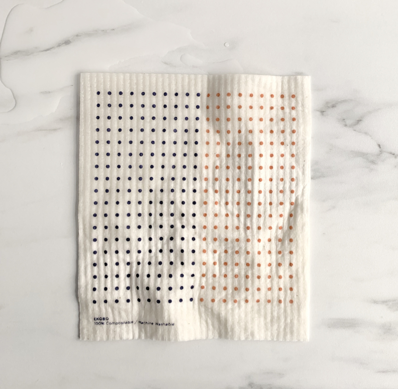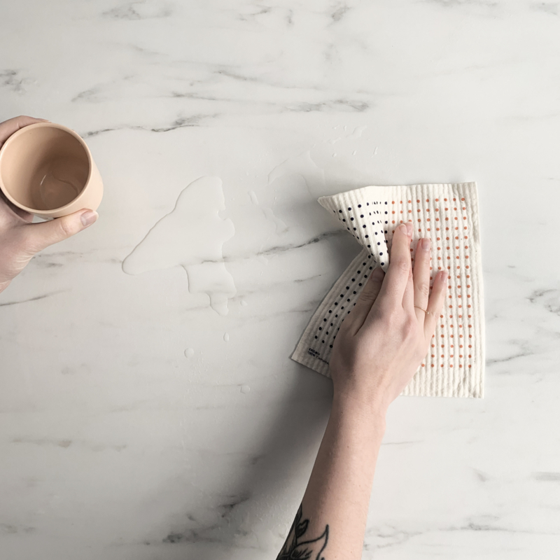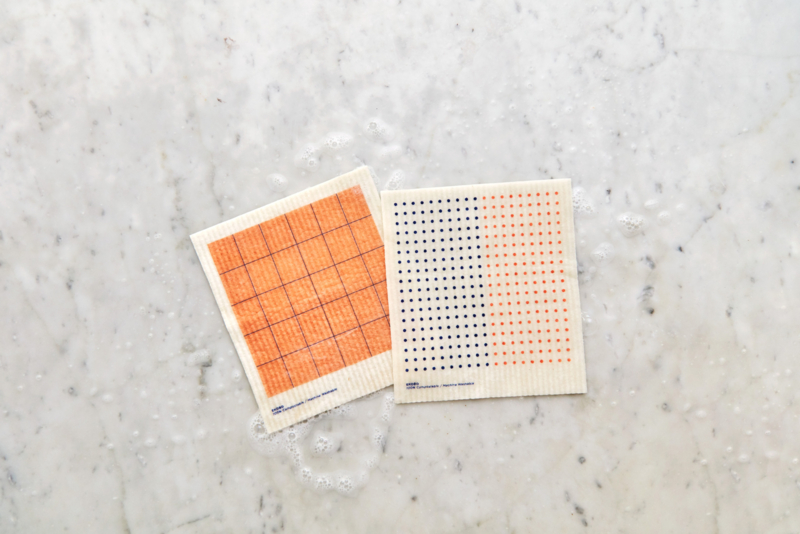 Set van 2 huishouddoekjes - 1 met ruitjes, 1 met stipjes - gemaakt van een puur natuurlijke mix van katoen en cellulose (katoenvezels), bedrukt met plantaardige inkt.