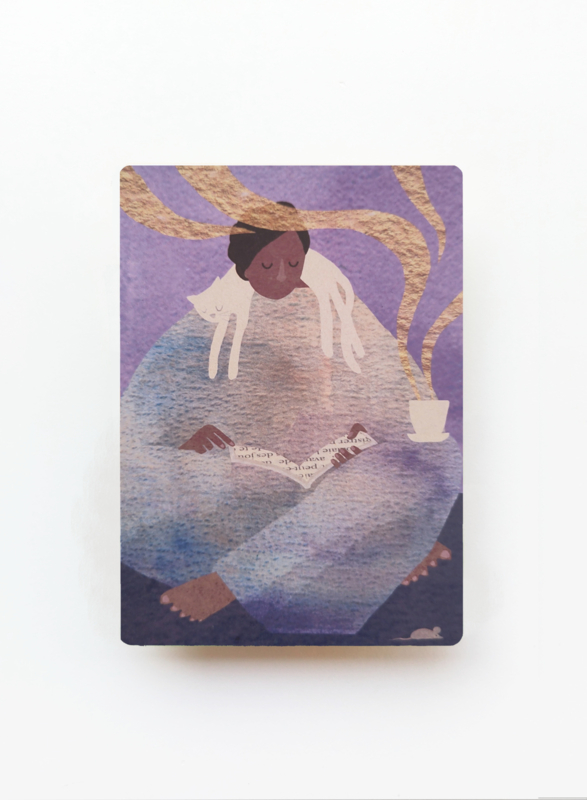 Droom maar even weg met deze postkaart van Madame Ziba. Een kat die ligt te slapen over je schouders, een grote mok warme thee en een boek om helemaal in te duiken. Leuk om aan de muur te hangen of naar iemand op te sturen.