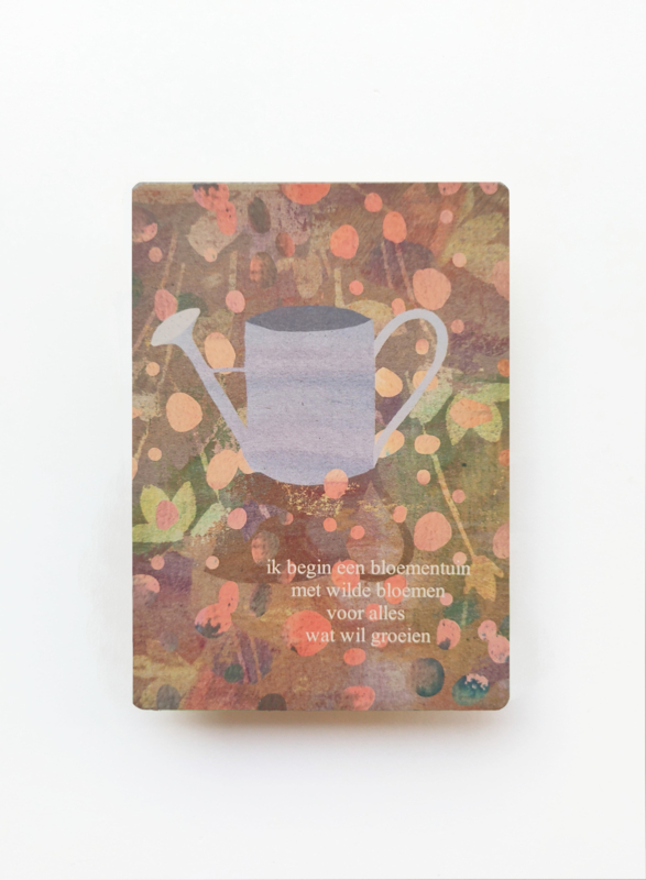 Postkaart Bloementuin van Madame Ziba is mooi om aan de muur te hangen of zomaar met een lieve boodschap naar iemand toe te sturen. Op de kaart staat een gieter tussen wilde planten en bloemen. Eronder staan de woorden "ik begin een bloementuin met wilde bloemen voor alles wat wil groeien".