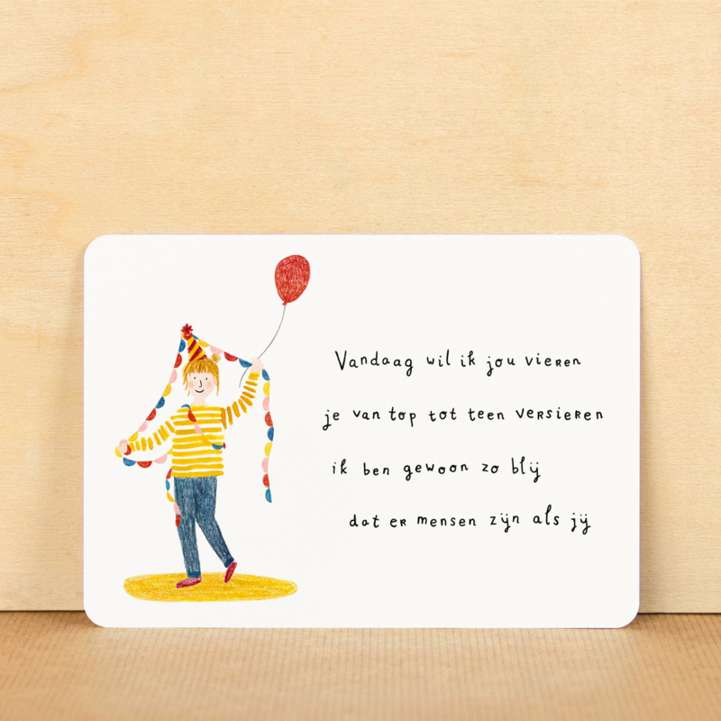 Postkaart Vandaag wil ik jou vieren - ninamaakt zonder envelop Maat kaart 10,5 x 15 cm Materiaal: Gedrukt in Nederland, op BioTop papier (0.a. chloor-vrij)