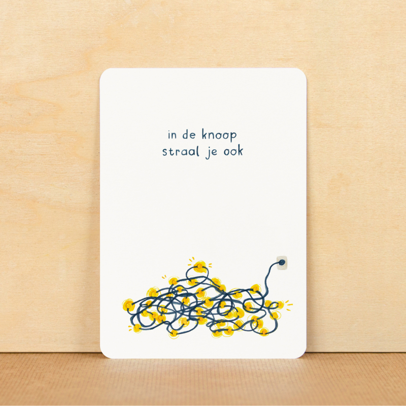 Postkaart In de knoop straal je ook - ninamaakt Maat kaart : 10,5 x 15 cm Materiaal: Gedrukt in Nederland, op BioTop papier (0.a. chloor-vrij)
