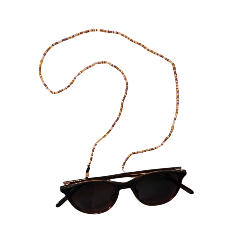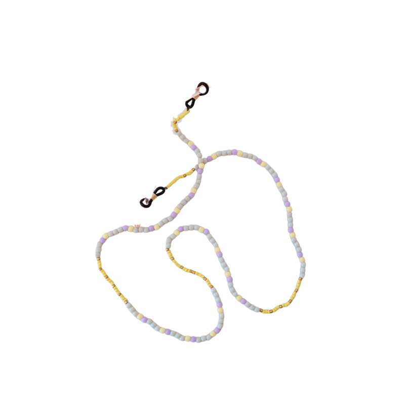 Zonnebril Koord Lila/Geel - Sammy Ray Maat: 70 cm lang Materiaal: tweedehands kralen op elastieken draadje met rubberen lusjes om aan je bril te bevestigen Past in een brievenbus pakketje