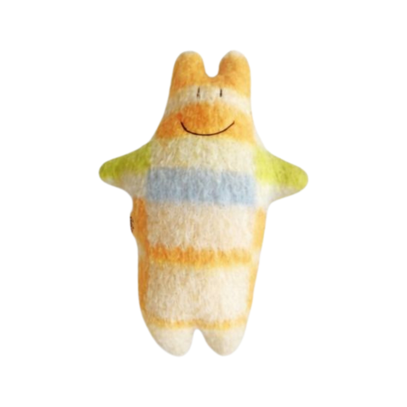 Baby Hippo Knuffel Geel geblokt - Sammy Ray Maat: 35 cm hoog en ongeveer 9 cm dik Materiaal: buitenkant van vintage wollen dekens en gevuld met knipafval van textiel